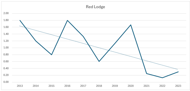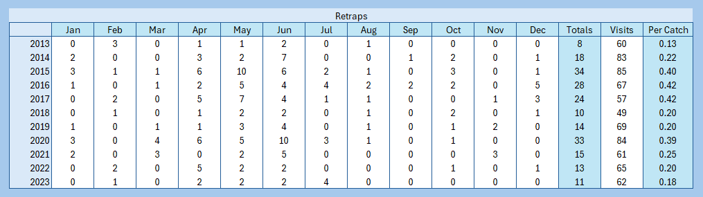 What is clear from graph 2 is that the number of birds being recaptured is relatively stable, just a slight decline, whereas the key element in the decline of the catches is in the number of birds being ringed. Obviously, 2013, being the first full year of study across the entire Forest, has the lowest incidence of recaptured birds. This might explain the slight decline, although the lower catches in 2022 and 2023 has almost certainly added to that.