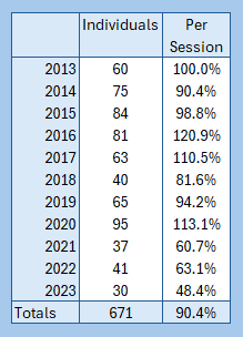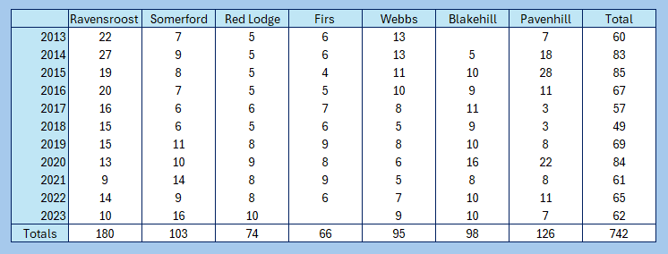 As you can see, the 2020 spike counteracts the 2018 trough, and the decline is significantly reduced. The question has to be: what has sparked such a decline in the last three years? I wish I knew the answer, so I decided to see if the decline is across the board or focused on any particular location or locations. The first thing that comes to mind is the coronavirus pandemic and its impact on our activities, which changed the focus of the sessions. Lockdown explains the spike in sessions in my own back garden. Then in October 2022 the Firs was closed for removal of any remaining ash trees, for die-back mitigation, as the landowner was concerned that they might be found liable if anyone was injured by falling trees or branches. It hasn’t reopened to the public or for survey work since, as the contractors left it in a dangerous condition. Ravensroost Wood was also out of contention over winter of 2022 / 2023, due to more ash mitigation work, plus the 25 year coppicing becoming due, which required the use of specialist contractors, and there was too much activity and disturbance to make ringing sessions viable or safe during that period. This table shows the number of sessions by site by year: