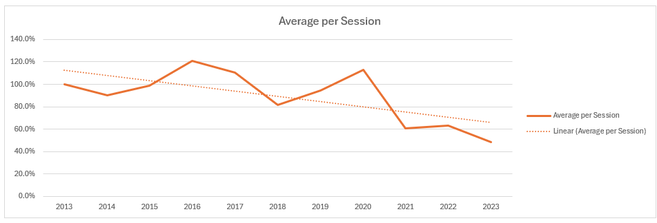 The bald numbers don’t tell the whole story, which is why I have analysed the numbers broken down by the total number of sessions, as per the end column. This gives the following graph: