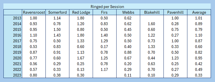 Every site is showing a reduction in the numbers ringed per session, with the exception of the Firs. That, alongside Pavenhill (my back garden), has the most volatile catching record. The following table shows the trends compared by site over the period of study: