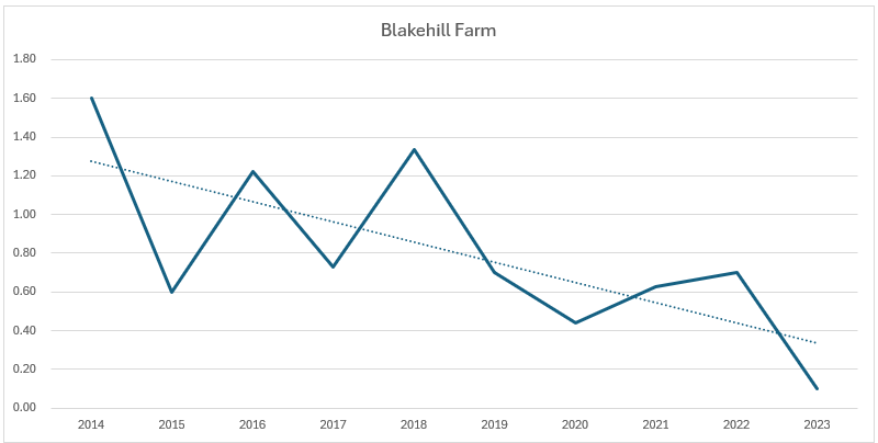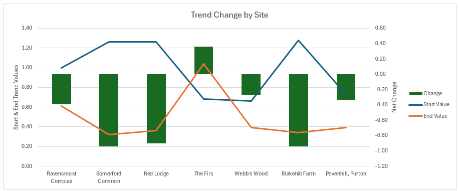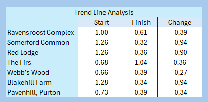 What this clearly shows is that, although all bar one change has been negative, the biggest overall changes are the reduction in catches at Somerford Common, Red Lodge and Blakehill Farm. From my knowledge of the sites, it is hard to know what the drivers are. Blakehill Farm is managed as it always has been: a low intensity beef and sheep farm with extensive hay meadows, copses and hedgerows. Our ringing areas at both Red Lodge and Somerford Common have had some management activity: harvesting of Beech at Red Lodge, but that was over five years ago and the basic structure of the wood has not changed. Where we ring at Somerford Common has not undergone any major changes in the period covered by the study.