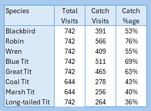 So, the Blackbird is caught in just over one in every two sessions, comparing well with the Wren, but somewhat lower than the Robin, Blue and Great Tit.