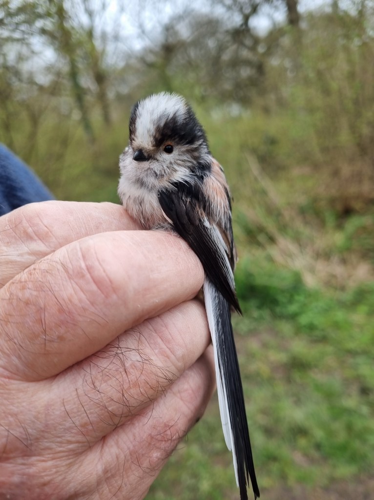 We only caught 15 birds, 12 new and three retraps. It started with a retrapped Blue Tit and a Chiffchaff at 7:30. That was the shape of things to come: between one and four birds every 25 minutes, mainly just one or two, sometimes none. The second round comprised two more Chiffchaff and a Blackcap. All three Chiffchaff were able to be sexed as males and the Blackcap was a female. The first of the year, the others caught at Lower Moor Farm on 30th March were all males.