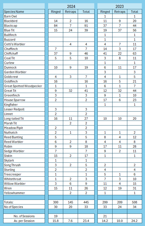 Despite the awful weather we did manage to get 19 full sessions in during the month. I was particularly affected, only making four of eight scheduled sessions and only 102 birds processed by my team. Last year I managed seven April sessions. Fortunately, others took up the slack so we ended up with the 19 full sessions, compared to 21 in April 2023.