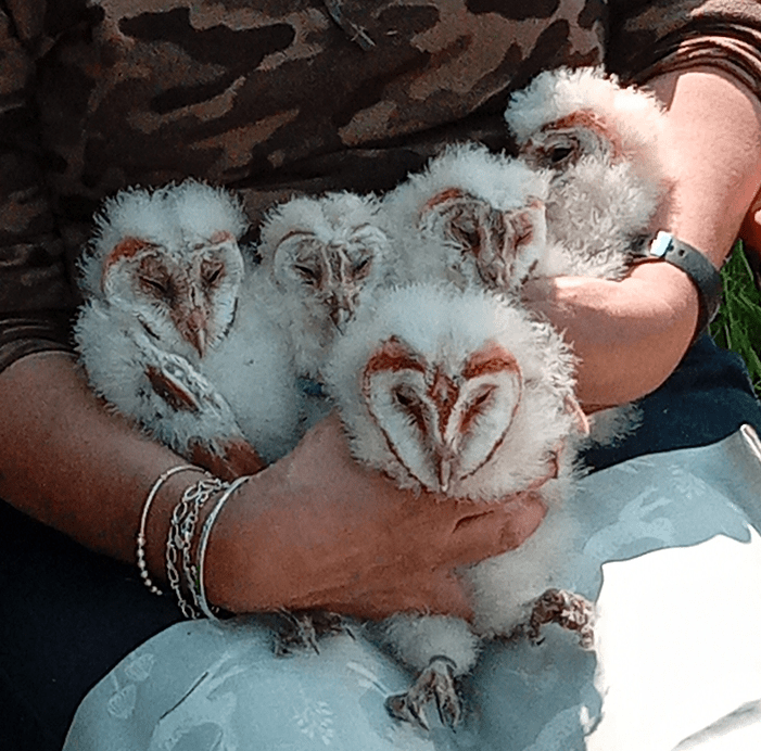 The rest of the day went well. We ended up ringing four broods of Barn Owl: comprising the first three, then a remarkable brood of seven and two broods of five each. All were good weights, mainly with feathers medium. One or two of the younger ones were still feathers small: