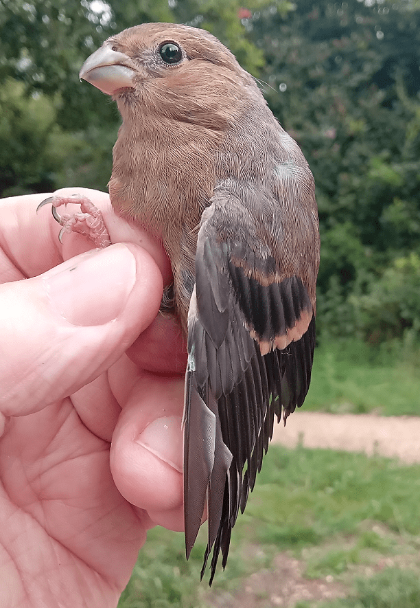 We have caught very few Bullfinch so far this year: before today we had ringed just six of them. Today we caught three: one was an adult male but, unfortunately, it was showing signs of Fringilla papillomavirus on both legs. It wasn’t pronounced or well advanced but we never process sick birds and, as FPV affects the legs, it would be even more crass to put a ring on it. The beauty of today’s catch was that the two birds we did catch were our first juvenile Bullfinches of the year: