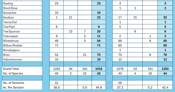 Added to the list for this month compared to 2023 are: Coal Tit, Hobby, Linnet, Meadow Pipit, Nightjar, Reed Bunting and Stonechat. Missing from the list were: Great Spotted Woodpecker, Green Woodpecker, Mute Swan, Red Kite, Sparrowhawk, Spotted Flycatcher, Stock Dove, Tawny Owl and Woodpigeon. Of those missing from this list, the Sparrowhawk and the Red Kite were processed at the RSPCA Oak & Furrows rehab centre, so weren’t wild caught. So, if we strike those two off, we have the same number of species but with differences.
