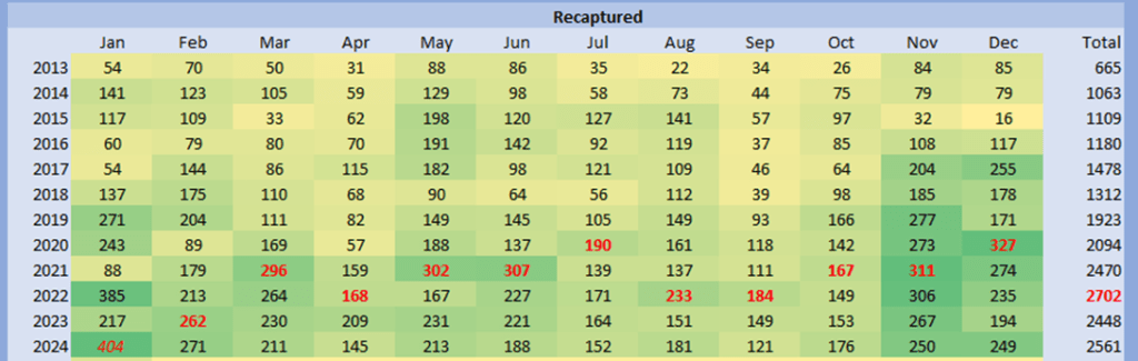 As you can see, the numbers are consistent across the years, with both ringed and retraps showing a slight increase over time, ringed showing a slightly higher incline than retraps.