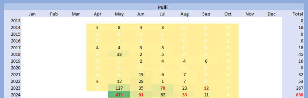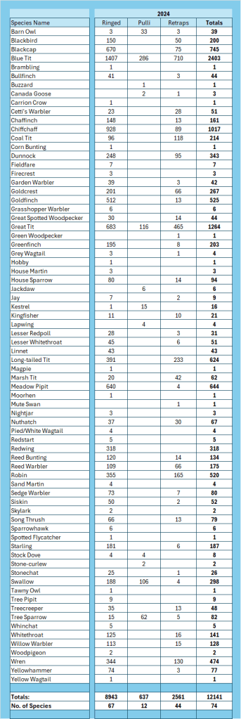 As you can see, a huge increase in the number of pulli ringed. This is almost entirely down to Jonny’s expanded activity in monitoring nest boxes for Blue and Great Tits plus Tree Sparrows. We also had a better year for Barn Owls.