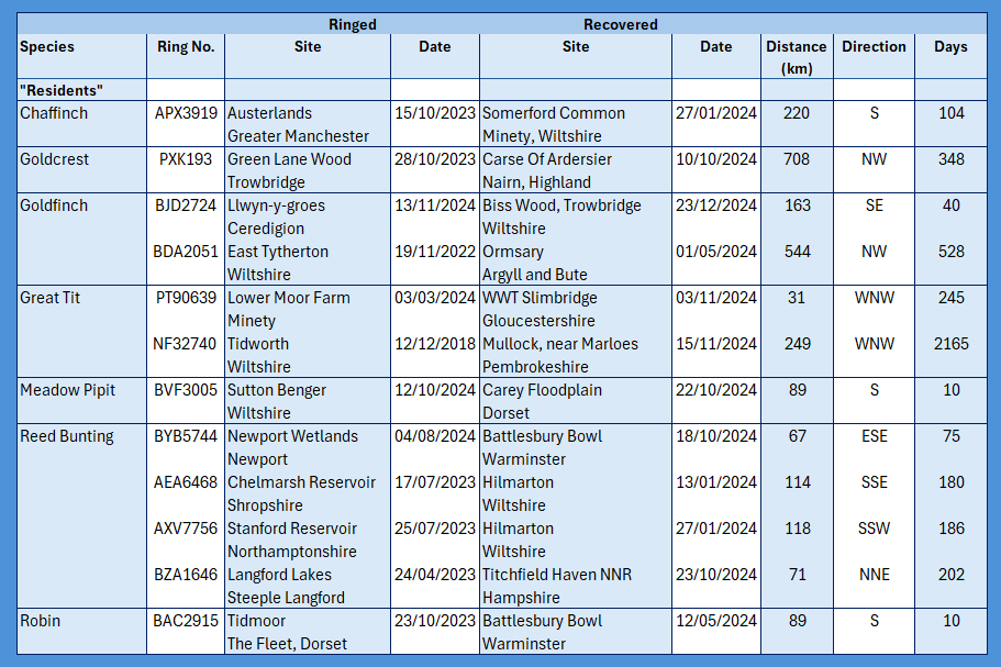 This report covers those movements of birds either from previous years but not received until 2024, plus recoveries reported for 2024. Those recoveries have, generally, moved over 50km and have either not been ringed by us, or have been ringed by us but recaptured by others.