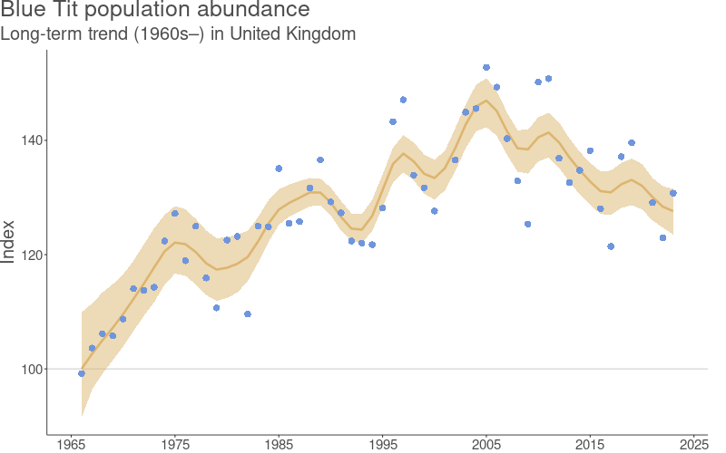How does this tie in with Blue and Great Tit populations? According to the BTO’s BirdTrends report (BTO, 2024), both Blue and Great Tits increased steadily, with occasional dips, from “the dawn of time” (ca. 1960s) to the late 2000s, but have since declined slightly: