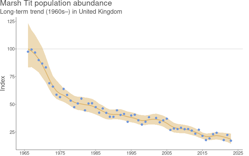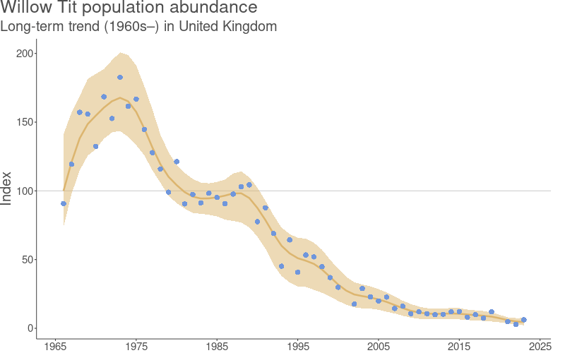 - The populations of Marsh and Willow Tits haven’t rebounded in response to the recent decline in Blue and Great Tits – while this doesn’t rule out a role for Blues and Greats in Marsh and Willow decline, it does suggest that something else (almost certainly habitat destruction) is the major limiting factor for Marsh and Willow Tit populations.
