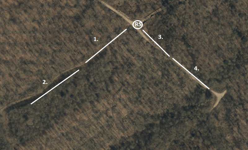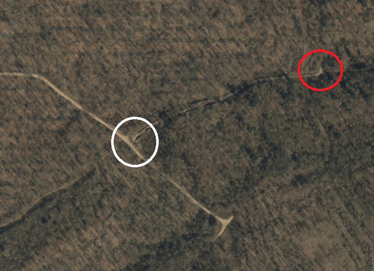 As I was being joined by Miranda, Laura and Ellie for the session, I was rather concerned that we didn’t have a similar poor result. I decided to take a chance and completely ignore our usual net rides and try out somewhere that I hadn’t tried for a long while. It was a bit of a gamble: our average April catch at Webb’s Wood in April is just 21 birds from 8 species. In the diagram below, the red circle is where we usually have our ringing station, the white one is where we set up today: