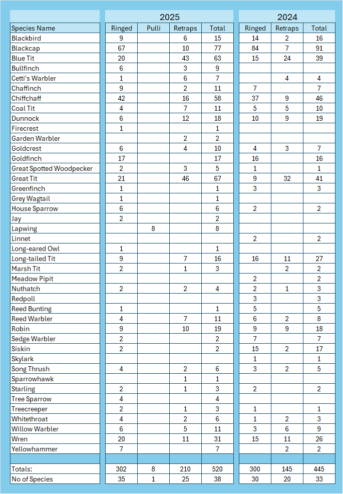 Added to the catch this year were Bullfinch, Firecrest, Garden Warbler, Grey Wagtail, Jay, Lapwing, Long-eared Owl, Sparrowhawk and Tree Sparrow. Missing from the list this year was Linnet, Meadow Pipit, Redpoll and Skylark.