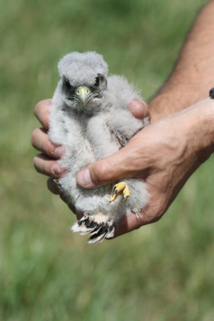 Now to the success stories of the afternoon: the Kestrels. We checked 16 Kestrel boxes and found four successful broods of Kestrel. The first brood were surprisingly small: just two small, downy chicks, but big enough to ring:
