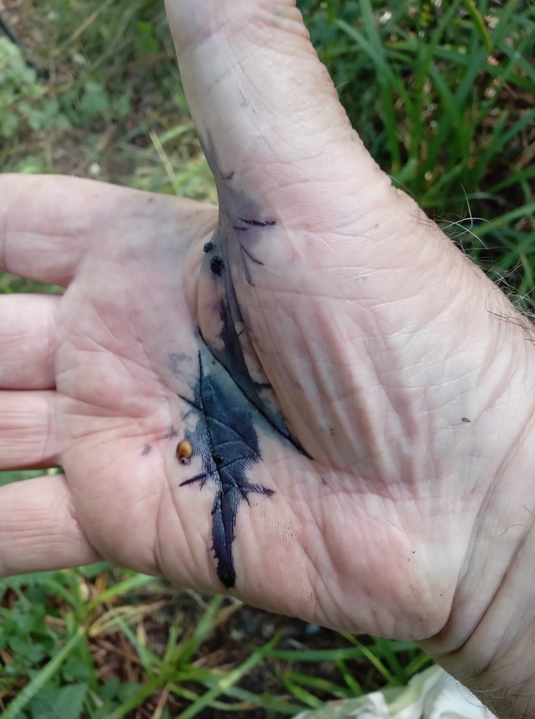 You can tell when the autumn berries and fruits are beginning to ripen: bird poop stains your hands purple. Today’s was the first I have had this year: it came from an adult female Blackcap. Her brood patch is just about ready to feather over and her wings and tail were already well advanced in their moult, so her breeding season is over. She will now be stuffing herself on berries and drupes to put on fat for her winter migration. Time to start looking at the fat deposition rates on migratory birds.