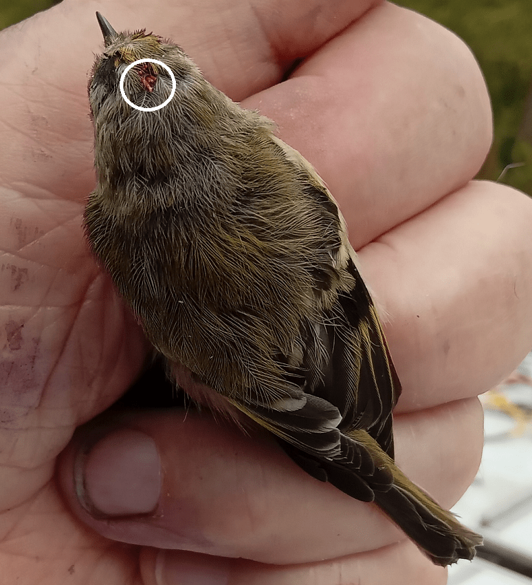 Both sides of its head were equally badly infested. Underneath the ticks you can see were others hidden by the bigger ones. There had to be well over 100 ticks on this bird’s head. Some ringers are opposed to tick removal: “interfering with nature”. The BTO are happy either way, provided that you are competent to remove them. I spent quite a long time cleaning off the ticks from this bird. Am I competent? Not a single bleed was left after removal: I think that is competence. It is highly unlikely that I got them all, but the burden has been much reduced.
