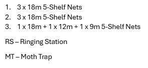 The ringing team and Rosie met up at 6:30 by the Whitworth Building, to get the nets set up. My team was David, Laura and Adam, with Mark coming along to help with the set up. We set the following nets: