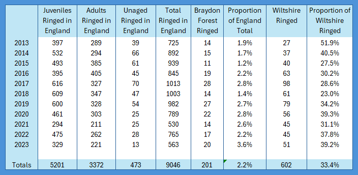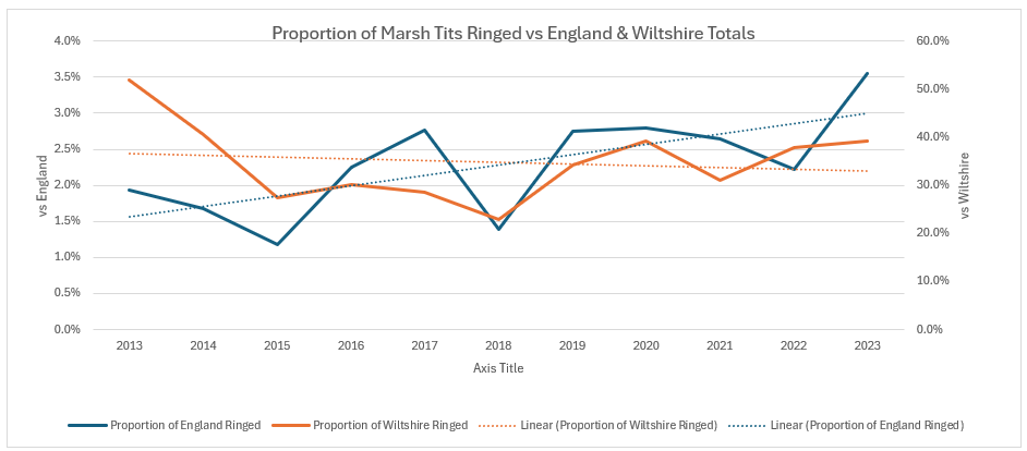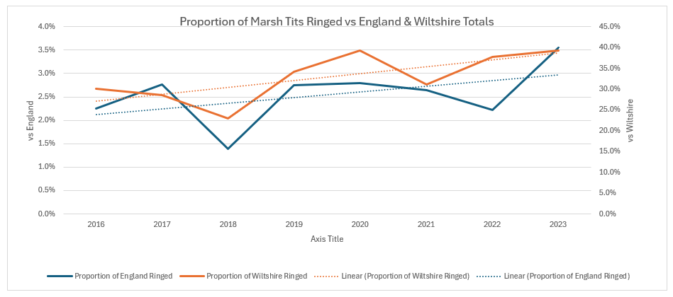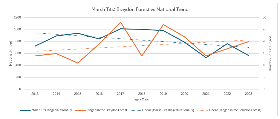 We have had a good year so far. Some recent correspondence got me thinking, once again, about the actual status of the Marsh Tit in the Braydon Forest and how that compares with both a local and a national profile. Having been studying them since I started ringing in the whole of the Braydon Forest in late 2012, it is rather important to me. Having persuaded Forestry England to make the Marsh Tit their priority bird species for management of their areas in the Forest, it is doubly so. So I had a look at the available records both locally and nationally. Unfortunately, we are still waiting on the 2024 ringing records to be published, so I have focused on the data published up to the end of 2023. Nationally, the BTO do not publish the number of retrapped birds, so I cannot do a national or Wiltshire analysis of individual birds, but I have done so for the Braydon Forest. I can tell you that 2024 was on a par with previous years in the Braydon Forest, and that 2025 is looking to be significantly better, but I don’t have the comparison for 2024 yet, although it should be published soon, given that the 2023 figures were published in September 2024. Obviously, we have another just under four months to go for 2025 data collection, but October and November are usually our best months for the species.