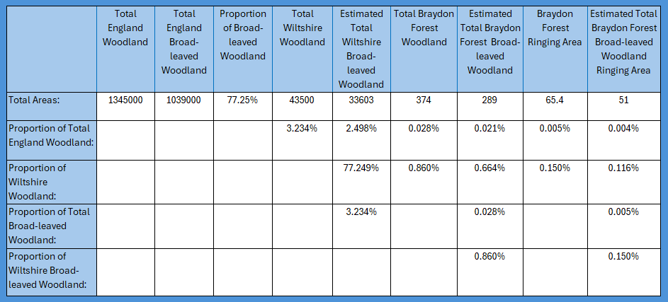 The first thing I did when analysing this was to look at the woodland make up of Wiltshire and then, for what I initially thought would be a bit of a joke, how that looks on a national scale. I was pleased and surprised to find how readily available those figures are from the Forest Research group. I took my figures from their latest paper for 2025. Of course, it is impossible to actually identify what proportion of any of the woodlands are suitable Marsh Tit habitat, but that applies across the whole of the UK, Wiltshire and the Braydon Forest itself, plenty of which is still farmed for conifer, parts of which, like Ravensroost Wood, are managed on coppice cycles. For example, Ravensroost Wood is a 40ha wood, approximately 10ha is 8-year coppice, some 15ha is 25 year coppice and 15ha is “ancient woodland”. So, by taking the figures as a whole, carries the same magnitude of error across the board. As Christopher Perrins noted in his esteemed volume on British Tits, Marsh Tit are almost exclusively a broad-leafed woodland species. Fortunately, I was able to separate broad-leaved woodland from conifer thanks to publicly available data from Forest Research. All area measurements are in hectares.