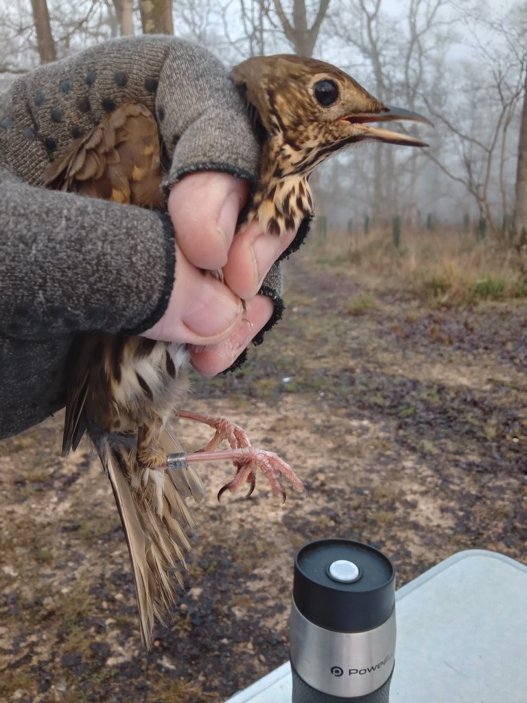 It flew into the net before we had a chance to open it. Fortunately, it just sat in the pocket of the top shelf and didn’t wrap itself in lots of net. In fact, I was just able to reach in and lift it out. That Song Thrush is the first that my team have captured and ringed since the 20th August 2025! The Redpoll was the first we have caught since the 20th November 2025 but we caught our previous Blackbird on the 31st December 2025.