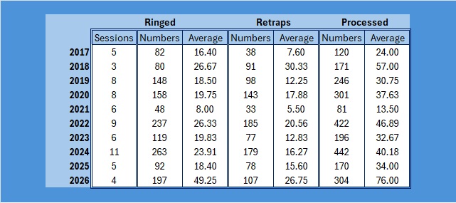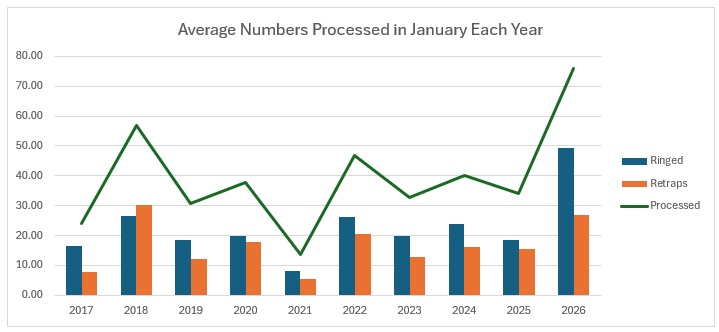 As you can see, it is not our largest catch in January, but it is our highest average number processed, our highest ever average ringed but not our highest ever retrap average. All I hope is that February is a lot better weatherwise.