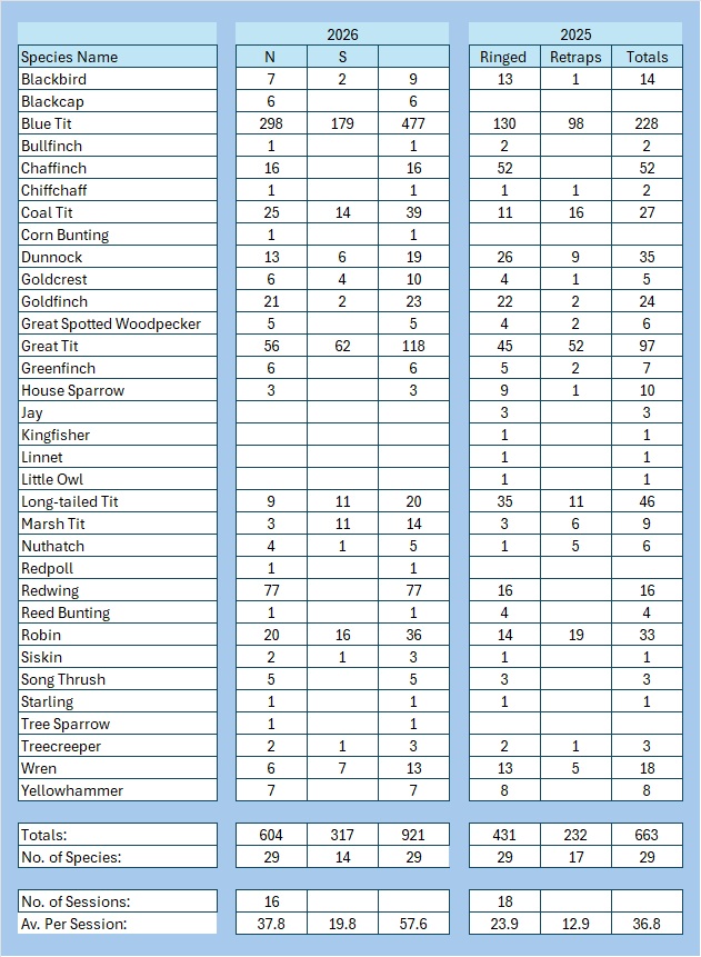 So the Group as a whole only managed 16 full sessions and we processed 921 birds from 29 species, compared to 663 from 29 last January. Ironically, we processed four species that we didn’t last year and last year we processed four species that we didn’t catch this January. We had a bigger catch of 1,241 from 33 species in 2024, but that came from 34 sessions.