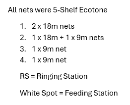 I was joined by Miranda and Ellie for the morning. We met up at 7:45 and set up the following nets: