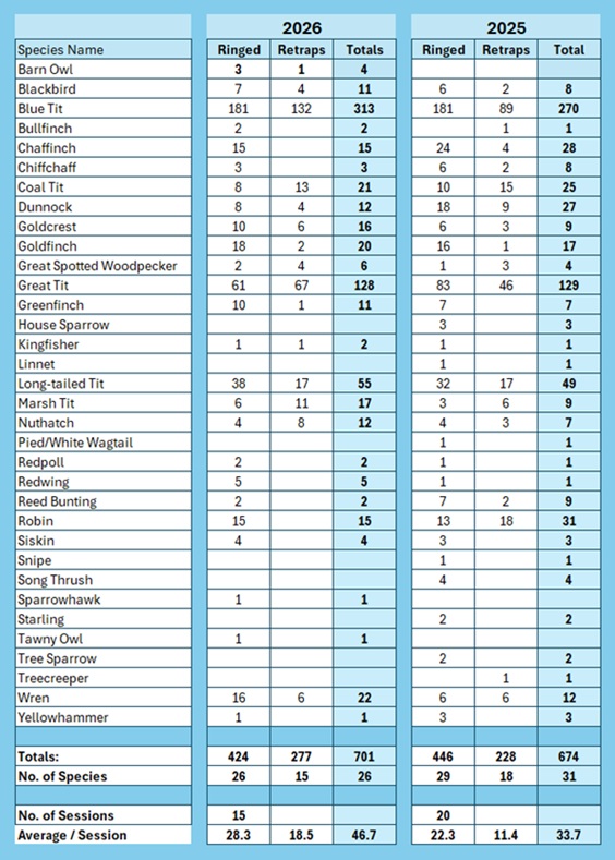 I cannot complete this without referring to my Marsh Tits: double the number ringed last February and nearly double the number retrapped! After last year’s excellent results, this is our best start ever: 9 ringed and 22 retrapped in the first two months of the year. The nine ringed is standalone the best for January and February in any year, the previous best was six last year. 22 retrapped is equal to the number in 2024, but more than in any other year.