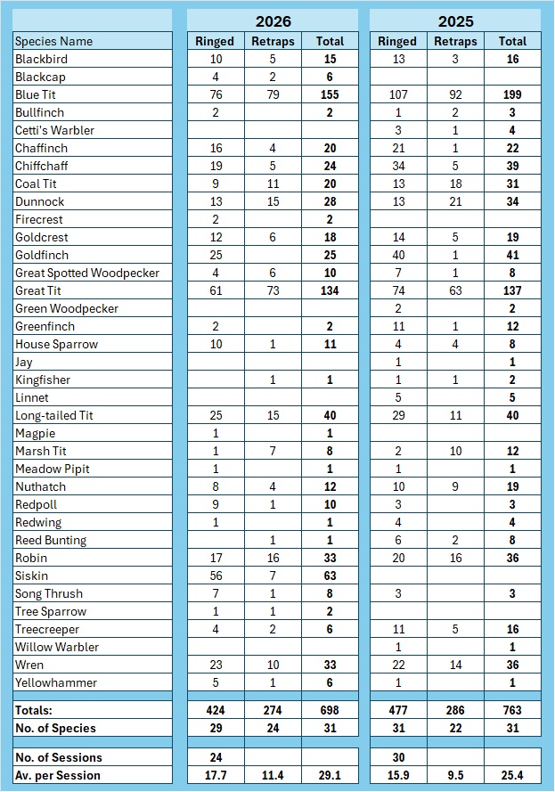 Anyway, hopefully the weather is going to improve and we will be able to get some good sessions in. One thing to note: the feeding flocks have definitely dissipated already: the average catch this March was 29.1 and the average catch in February of this year was 46.7. That said, we caught and ringed 29 species, 31 in total, whereas in February it was 26 species ringed and 26 species in total.