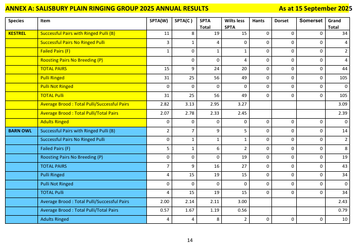 Included in this years catch but not in last were: Carrion Crow, Great Spotted Woodpecker, Jay, Magpie and, surprisingly. a Sedge Warbler, caught by Jonny at Langford Lakes. Missing from this year’s catch was quite a lot: Kestrel, Nuthatch, Pied Wagtail, Siskin, Song Thrush and Tree Sparrow.