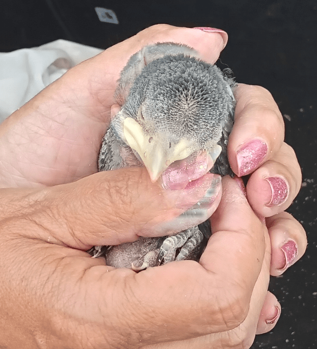 Nice, little bundles of fluff. Only he didn’t say when that was taken. I arrived on site at 14:30 and, with some help from the owners with a ladder and cups of tea, I managed to get the chicks bagged up and ready for ringing. They were considerably more developed than I was expecting. As you can see from the following photo, their feet and talons are very well developed: