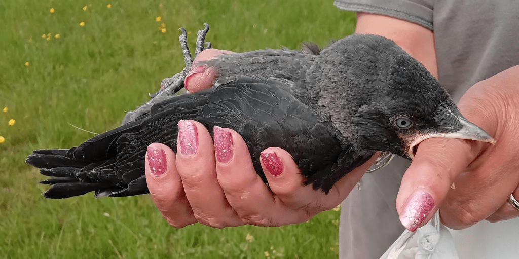 The last box we checked lies to the east of the farm. This one also had Jackdaw chicks in it. These are much further advanced: