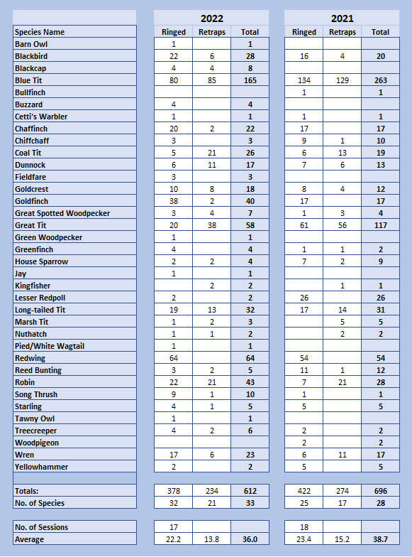 Although on the face of it we processed more species than last year, 70 against 68, in reality, the wild bird catch was 67 vs 68, as that 2022 total includes the ringing of the rehabilitated Peregrine Falcon at Mere Falconry Centre and the Buzzards and Tawny Owl at RSPCA Oak & Furrows.