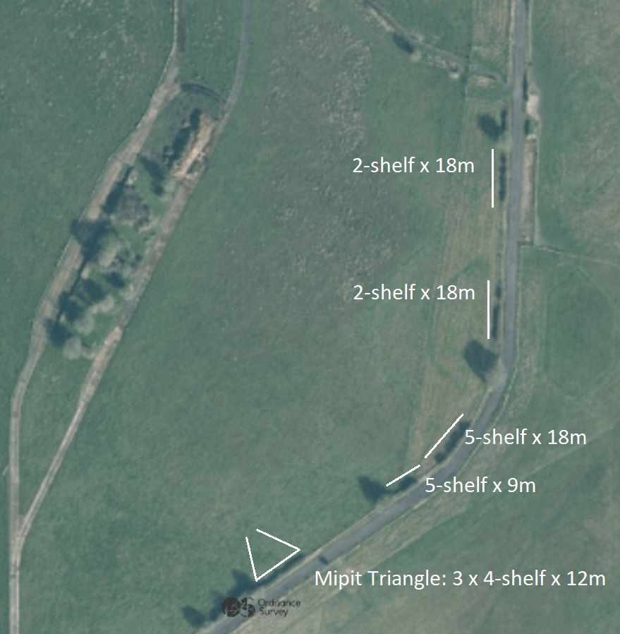 I have never tried ringing birds in that area of the site, but the Stonechats were a big draw. We set nets in the area where the Wildlife Trust trialled seeding the area with weedy, seedy plants, which did not work out and has reverted to a lot of thistle and ragwort in the main area and the blackthorn is spreading in from the Blackthorn in the hedgerow. The area in question is the paler area in the diagram below, in which all of the nets were set, except the Mipit triangle: