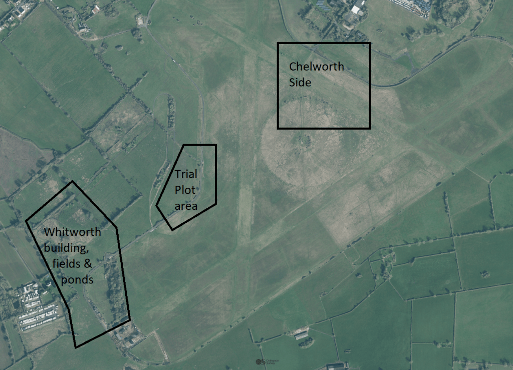 This area fits between my regular ringing sites at Blakehill. The Chelworth Industrial Estate side is the main area, followed by the fields and ponds adjacent to the Whitworth building, as shown in the diagram below: