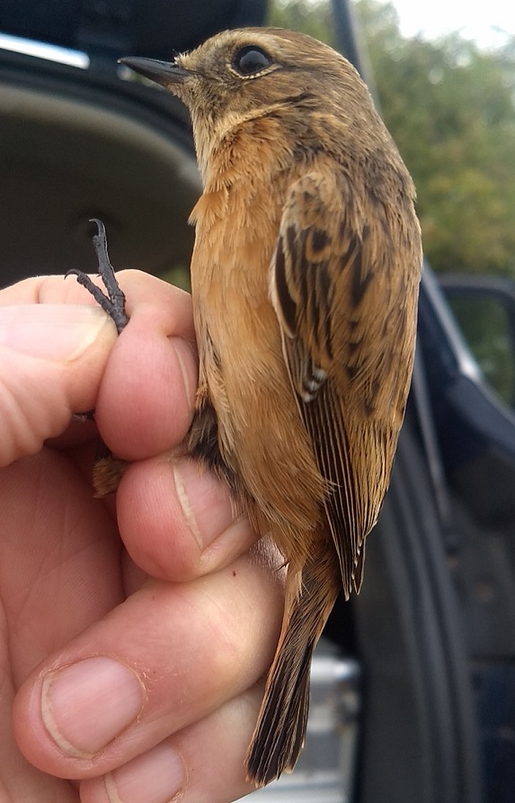 Miranda and I decided to close the nets at 11:30 and, as so often happens, the weather turned as the decision was made, the wind got up and we had to get the nets closed and down quite quickly. We were away from site by 12:30. As I was driving back up the perimeter track, three male Stonechat sat on the posts of the fencing closing off the trial area, with another further afield, at the top of a prominent, dead Dock seed head. That rather underlines that there are good numbers of Stonechat at Blakehill this year. When you look at the last couple of sessions, Blakehill has done extremely well for me and the team.