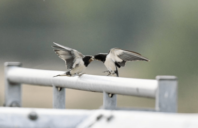 I spent yesterday morning checking and cleaning out Barn Owl boxes at Upper Waterhay Farm and Blakehill Farm, accompanied by local birder / photographer Chris Snook. Chris was hoping to get some photos of Barnies and, whilst he didn’t get any photos of them, he did get to see some. Better still, he got a fantastic picture of a juvenile Swallow being fed by an adult: