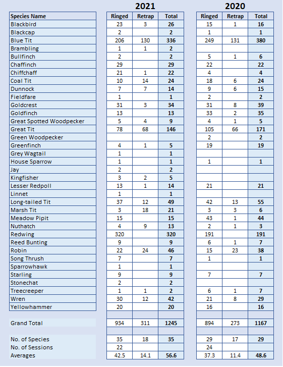 Snipe 1; Curlew 1; Barn Owl 19; Sparrowhawk 2; Woodpigeon 4; Stock Dove 2; Collared Dove 1; Swallow 1; Magpie 1; Jay 1; Jackdaw 2; Great Spotted Woodpecker 5(5); Nuthatch 13(18); Treecreeper 9(3); Blue Tit 384(170); Great Tit 154(129); Coal Tit 33(24); Marsh Tit 14(37); Long-tailed Tit 55(13); Wren 53(22); Meadow Pipit 62; Pied Wagtail 1; Grey Wagtail 1; Dunnock 23(10); Stonechat 5; Whinchat 12; Wheatear 1; Robin 72(33); Redwing 102; Song Thrush 16; Blackbird 26(15); Reed Warbler 1; Sedge Warbler 1; Blackcap 72(2); Garden Warbler 2; Whitethroat 5(1); Lesser Whitethroat 4(3); Chiffchaff 38(4); Willow Warbler 13(3); Goldcrest 71(12); Chaffinch 44(4); Brambling 2(1); Goldfinch 26(2); Lesser Redpoll 54(1); Siskin 1; Linnet 2; Greenfinch 2; Bullfinch 5(3); House Sparrow 7; Reed Bunting 10(1). Totals: 1,456 ringed from 51 species and 516 birds retrapped from 24 species, making 1,972 birds processed from 51 species.
