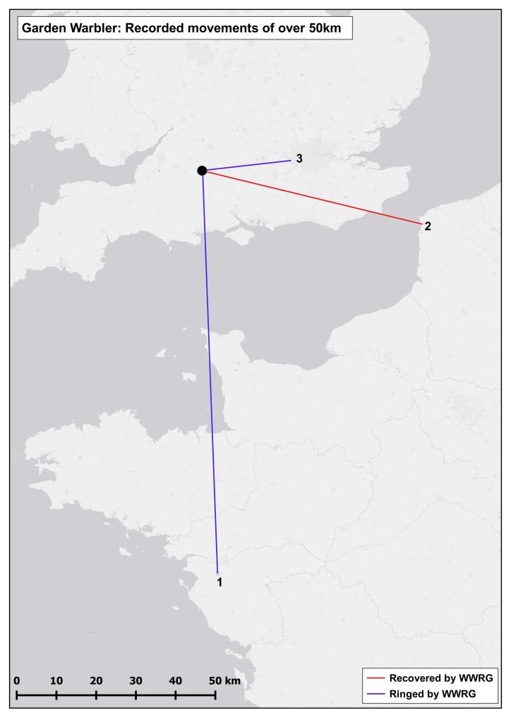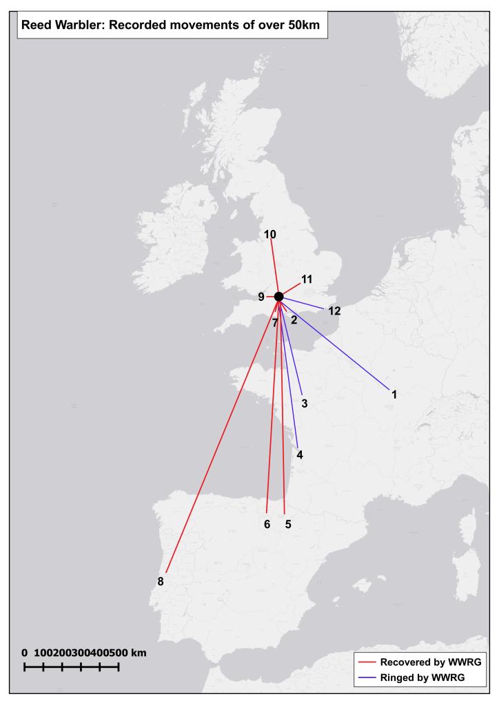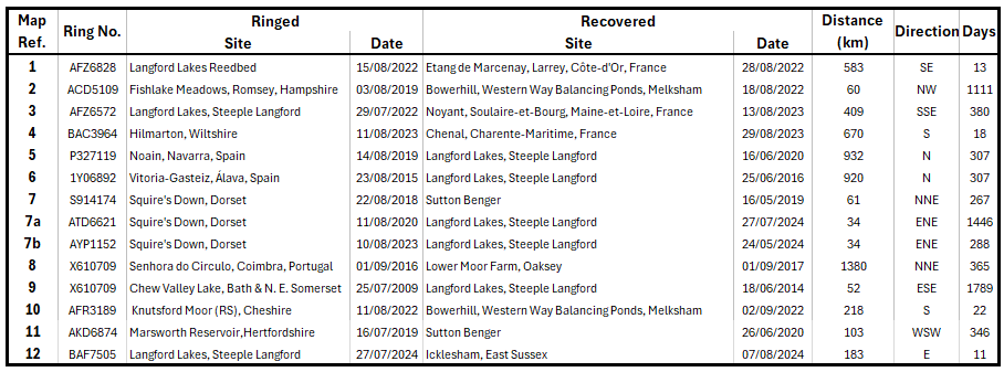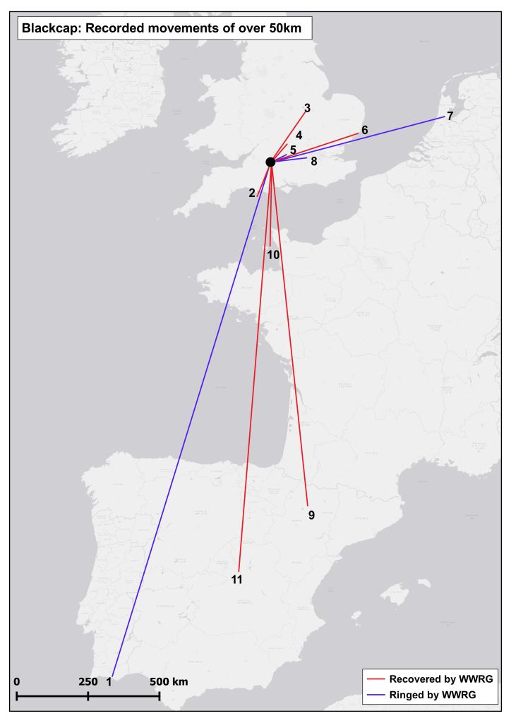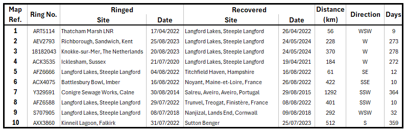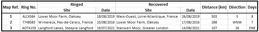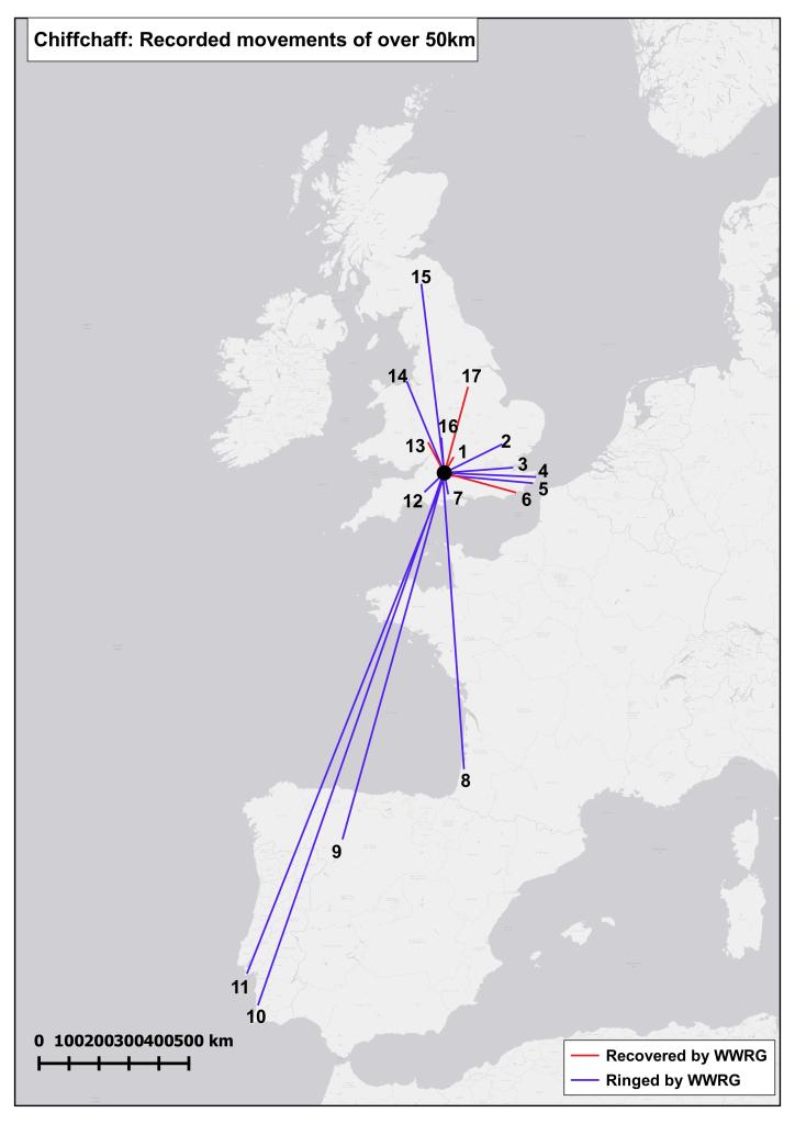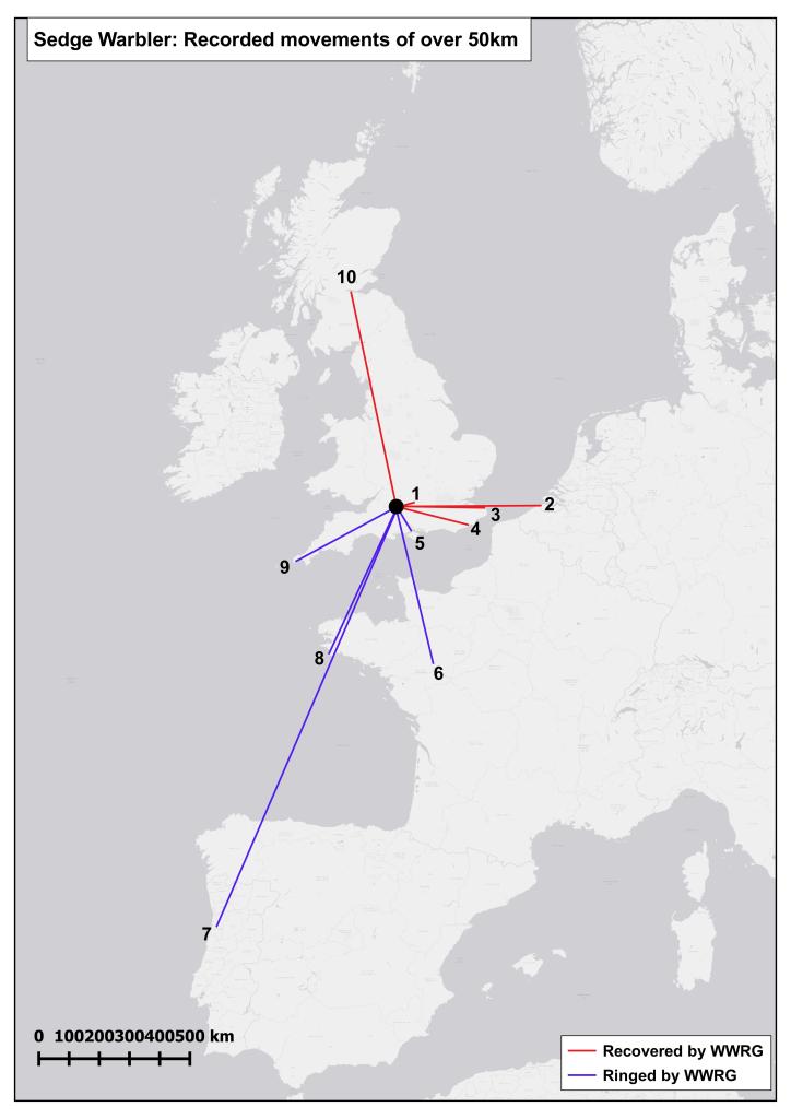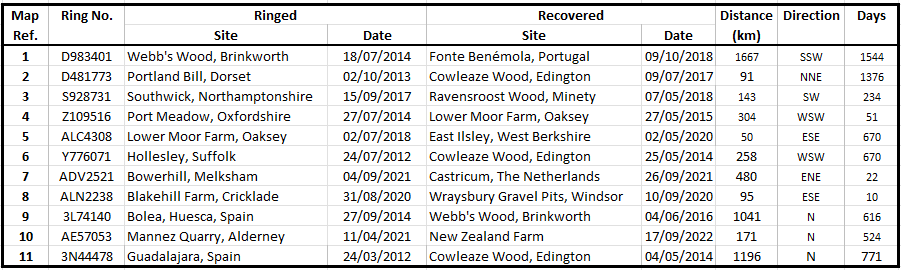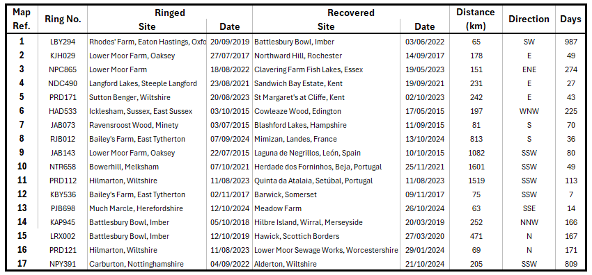 This page is focused on birds either captured by the West Wilts Ringing Group that were ringed 50km or further away or ringed by us and recovered elsewhere. It consists of a map followed by a table identifying the individual birds and their journeys.