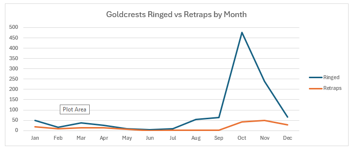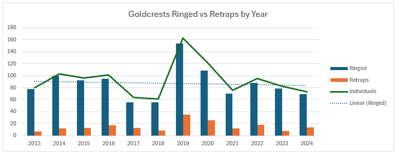 This brief analysis covers the period from the 1st January 2013 until 6th December 2024. I will update it at the end of the year, but this is to fill in the time, as Storm Darragh has prevented any ringing activity this weekend, and you can only do so much net mending without getting really, really bored. Over this period we have caught and ringed 1,046 Goldcrests and retrapped 164 birds. As a single bird may be retrapped multiple times, this represents a total of 1,051 individual birds.