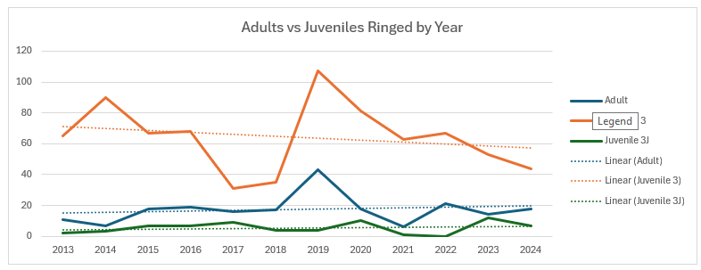 The trend line shows a shallow decline in the number of birds ringed, but if you exclude the big dip in both 2017 and 2108, plus the subsequent peak in 2020, it is pretty consistent.