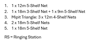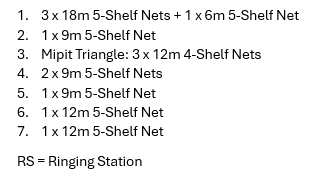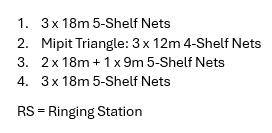 Today’s forecast was for it to be dry, and to have fairly low wind speeds, a base of 4 to 5mph, with gusts getting up to 15mph by 11:30. I was joined for the morning by David, Sarah and the entire Childs family, so I thought we could set couple of additional nets. This is what we set up: