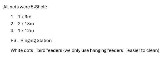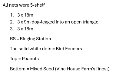 Having been away I didn’t get to top up the bird feeders until yesterday morning but, just like on the last session, the feeding station nearest our ringing station had attracted plenty of action: the seed feeder having been reduced by one-third and the peanut feeder by three-quarters. The feeding station further away showed very little sign of activity and, just like last time, the nets nearest them were the absolute busiest.