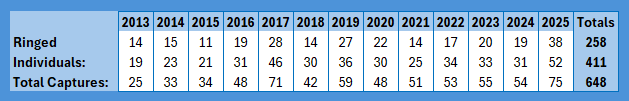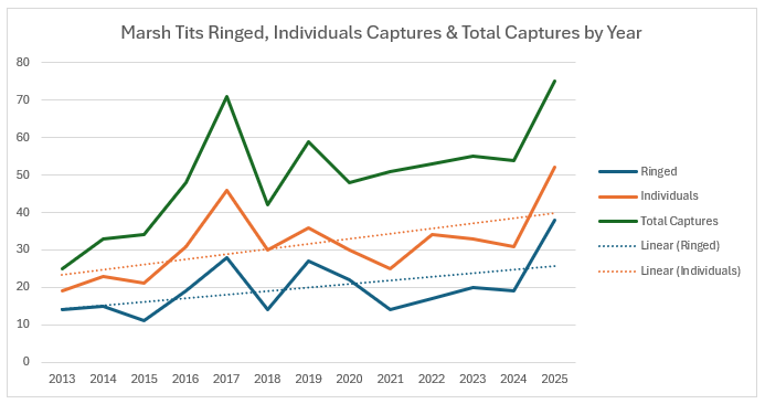 I am just astonished at what is happening with Marsh Tits in the Braydon Forest this year. We have ringed twice as many as we did in 2024 and ringed 10 more than we did in our previous best year: 2017! Where we will end up, I don’t know but we have sessions scheduled for Ravensroost Wood, Webb’s Wood, Somerford Common and the Firs before the end of the year. This is how it currently looks compared to previous years: